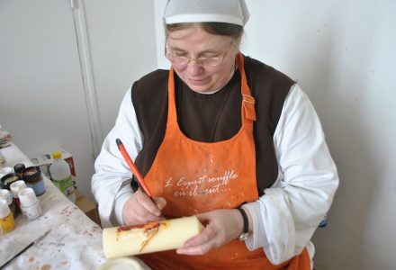 To help them grow in God and in their human capacities, their work is divided among the garden, keeping up the cottage, as well as our workshops that produce decorated candles, “Lumen Christi” statues, and wood crafts. Our house also undertakes an evangelization through work with couples and tourists, cooperating with the Catholic pastoral team of the Bay.