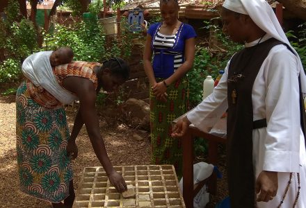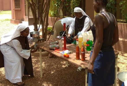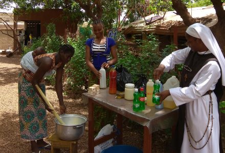 Nous faisons vivre un atelier de couture et de broderie, et un atelier de fabrication de savon et de shampoing. Ces ateliers ont un double objectif : la vente de nos produits pour couvrir les dépenses de la mission, d’une part, et d’autre part, l’apprentissage d’un métier qui servira à la réinsertion de nos jeunes femmes dans la société.