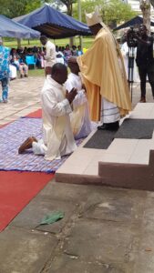 Avant cette grande célébration, les ordinands ont vécu un temps fort de retraite spirituelle au couvent des sœurs carmélites à Yamoussoukro, lieu de silence et de prière, pour se disposer intérieurement à recevoir l’appel de Dieu dans leur vie consacrée. Cette halte spirituelle fut un moment privilégié de recentrage sur le Christ, serviteur et prêtre éternel, modèle de toute vocation. La Messe d’ordination a débuté dès 10h30, pour s’achever à 12h45. Elle a été présidée par Monseigneur Marcellin Yao KOUADIO, évêque du diocèse de Daloa. Une organisation remarquable avait été mise en place, soutenue par les réalités d’alliance de la communauté ainsi que par de nombreux frères et sœurs venus d’autres foyers. Tout respirait la beauté de la communion et l’harmonie du service.